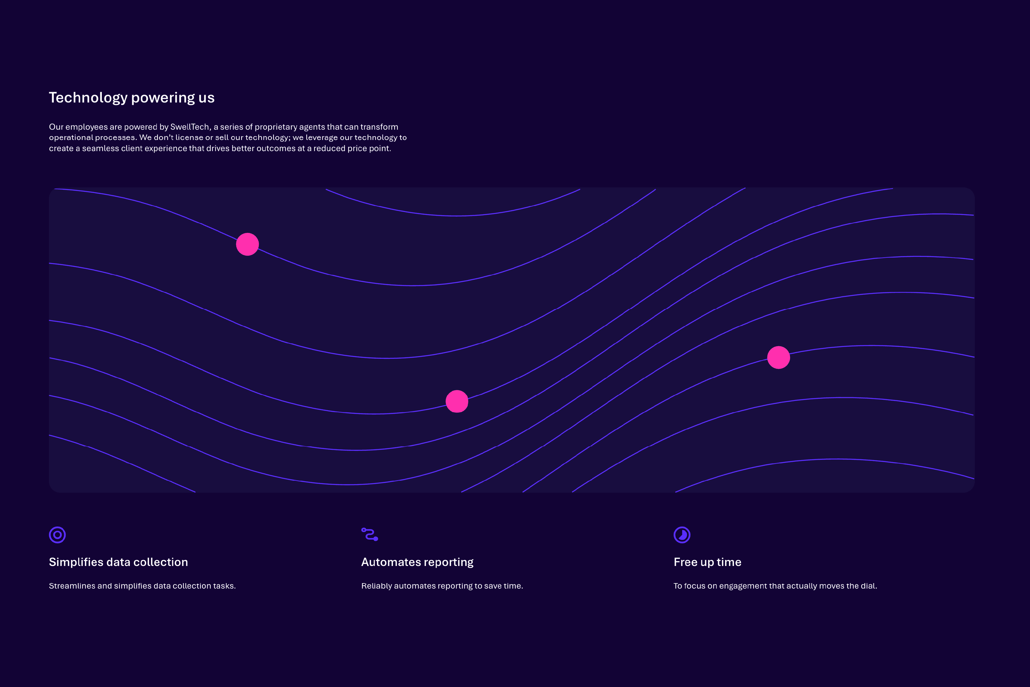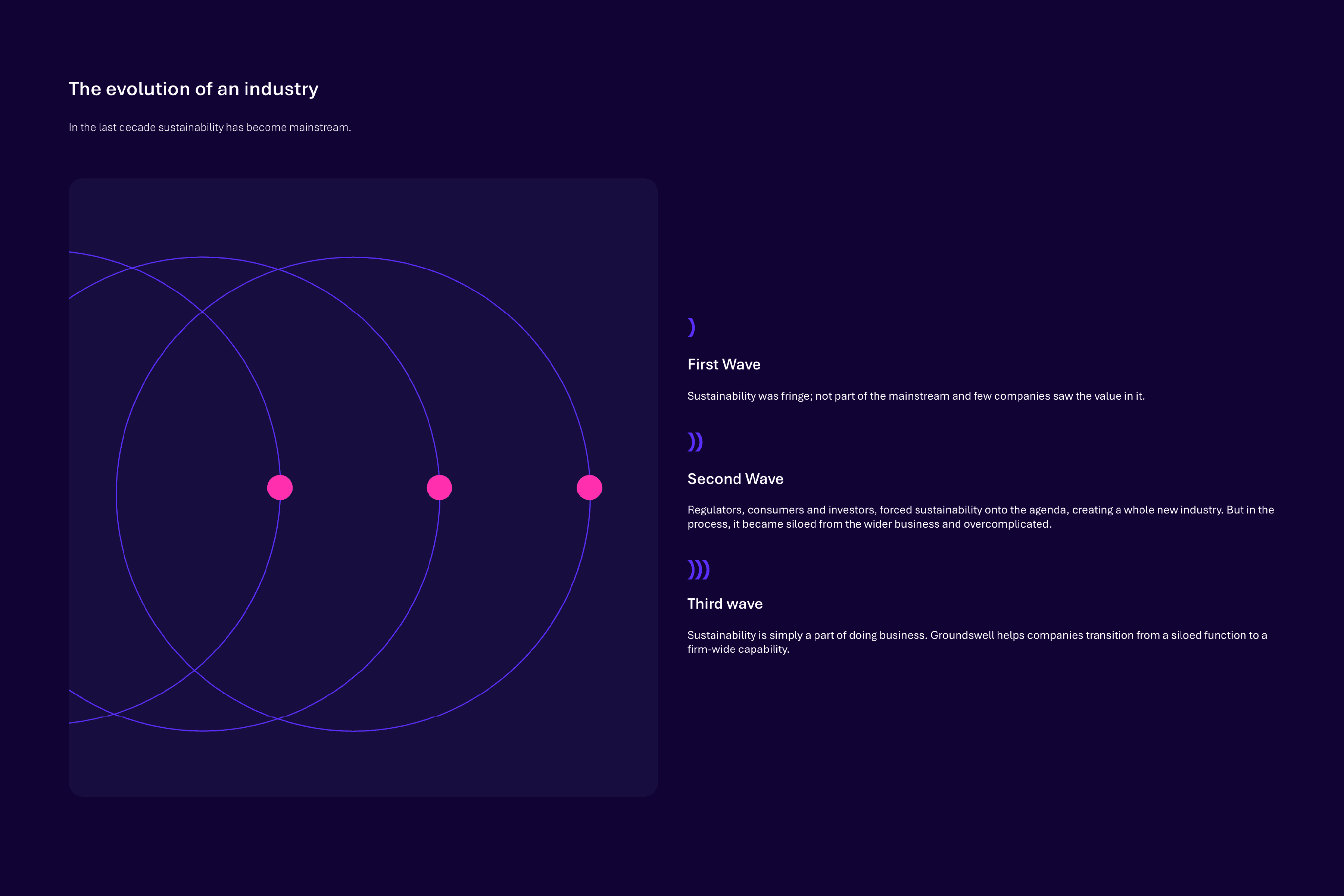 The visual identity resonates with the energy generated by groundswell. The dynamic 'orb' conveys the movement of people coming together, resonance, impact and disruption. The warm colours highlight the positive energy and meaningful impact we bring to every partnership.